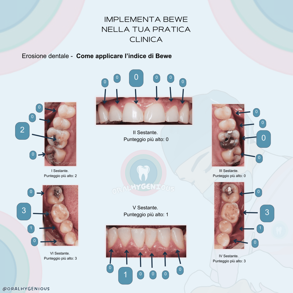 L’indice BEWE è un sistema di valutazione che consente di misurare l’erosione dentale attraverso una scala a quattro punti (da 0 a 3). Ogni superficie dentale viene esaminata singolarmente per determinare il livello di usura, e il punteggio assegnato al settore dentale più compromesso viene registrato. La somma di questi punteggi permette di determinare il rischio complessivo di erosione dentale per ciascun paziente.