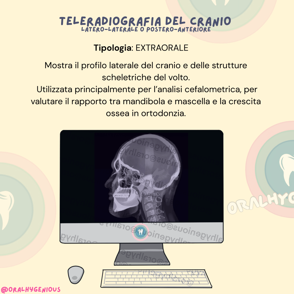 Mostra il profilo laterale del cranio (teleradiografia latero-laterale) o il viso di fronte (antero-posteriore).